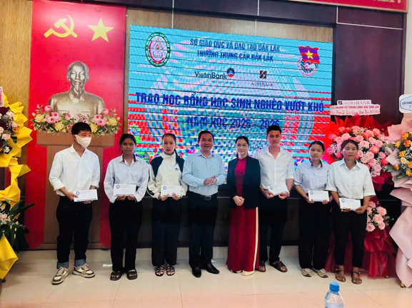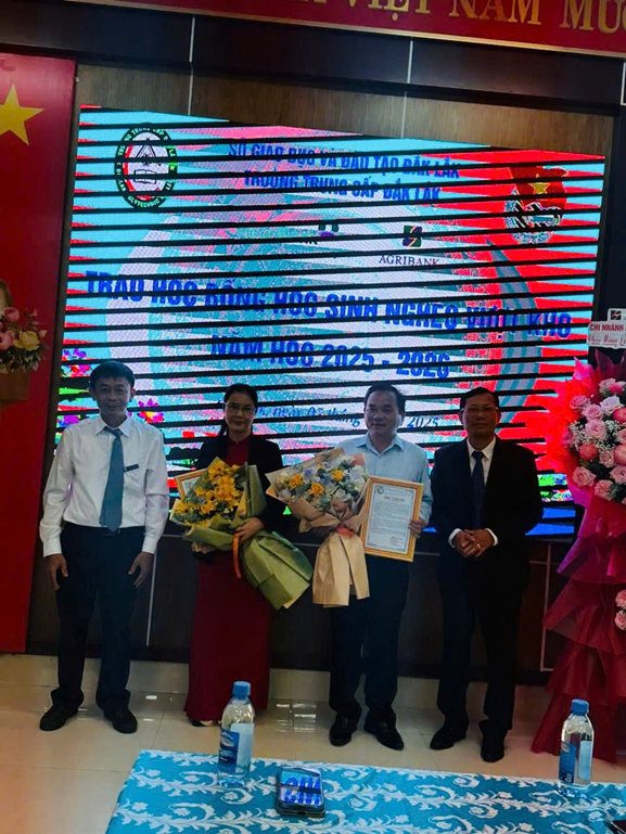 Bà Trần Thị Phương Lan Phó Giám đốc Agribank chi nhánh Nơ Trang Lơng Bắc Đắk Lắk trao học bổng cho học sinh nghèo vượt khó của nhà trường năm học 2025- 2026