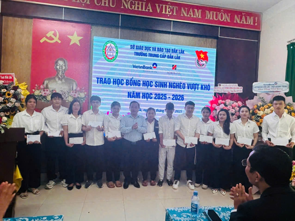 Ông Đinh Ngọc Thảo Trưởng phòng giao dịch Ngân hàng TMCP Công thương Việt Nam chi nhánh Đắk Lắk trao học bổng cho học sinh nghèo vượt khó của nhà trường năm học 2025- 2026