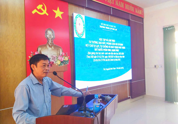ThS. Nguyễn Đình Thịnh - Bí thư Đảng bộ – Phó hiệu trưởng báo cáo viên chuyên đề “Học tập và làm theo tư tưởng, đạo đức, phong cách Hồ Chí Minh về ý chí tự lực, tự cường và khát vọng phát triển đất nước, phồn vinh, hạnh phúc”