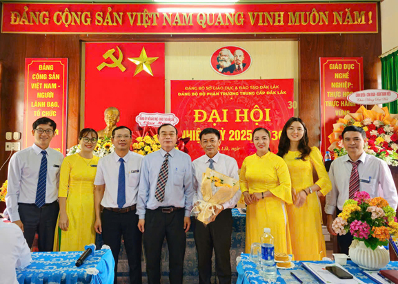 Đồng chí Nguyễn Hữu Quát phó bí thư Đảng bộ Sở Giáo dục và Đào tạo tỉnh Đắk Lắk chúc mừng và chụp hình với Ban chấp hành Đảng bộ nhiệm kỳ mới năm 2025–2030.
